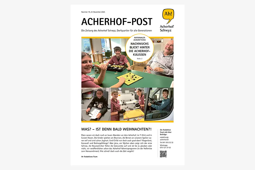 Die Acherhof-Post ist die Zeitung des Acherhofs Schwyz, Dorfquartier für alle Generationen. Sie erscheint am letzten Freitag des Monats. Beiträge (Texte, Fotos usw.) sind willkommen.